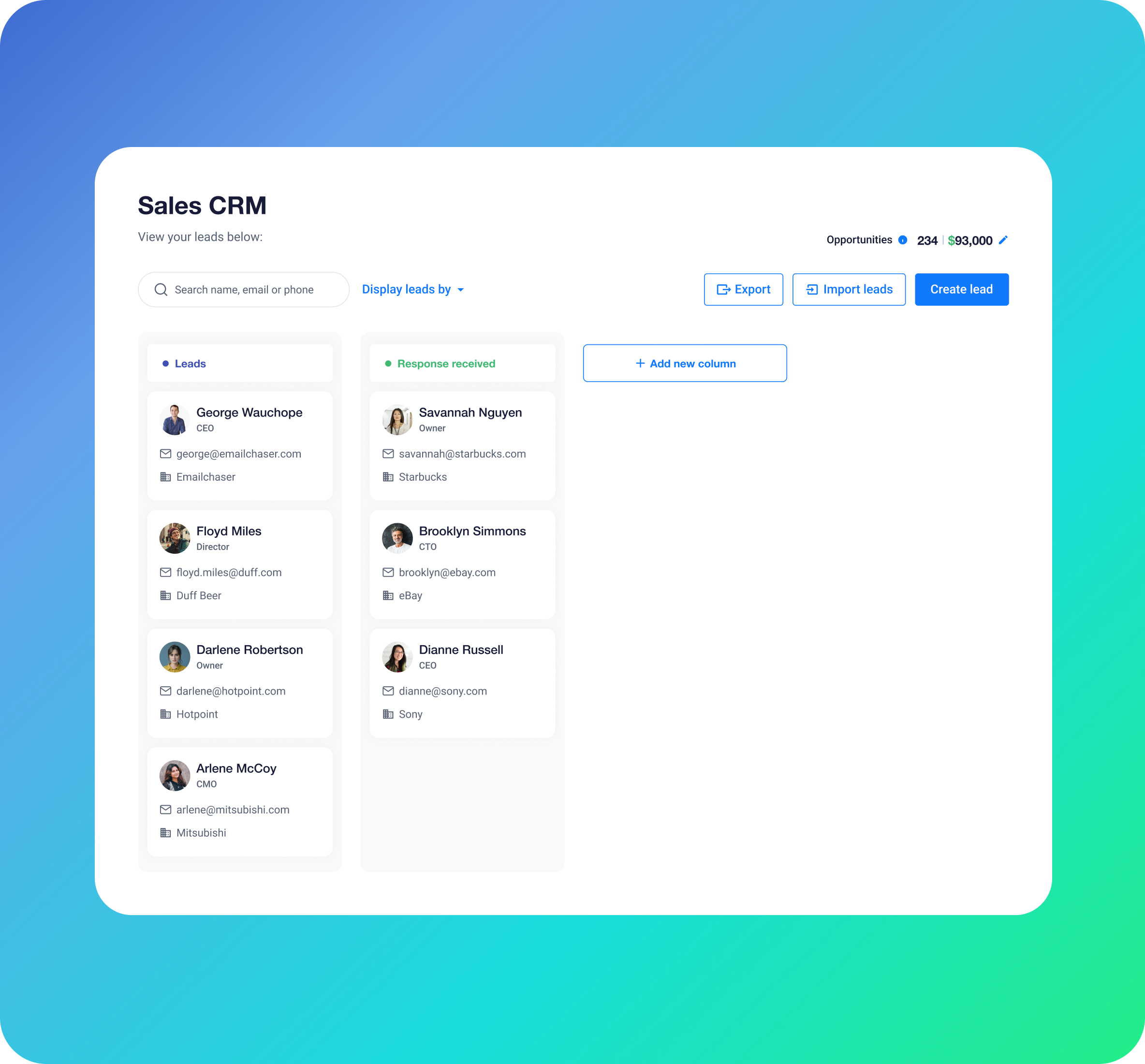 Easy-to-use sales CRM software. Create custom columns, forecast future pipeline revenue, and make notes about each lead.